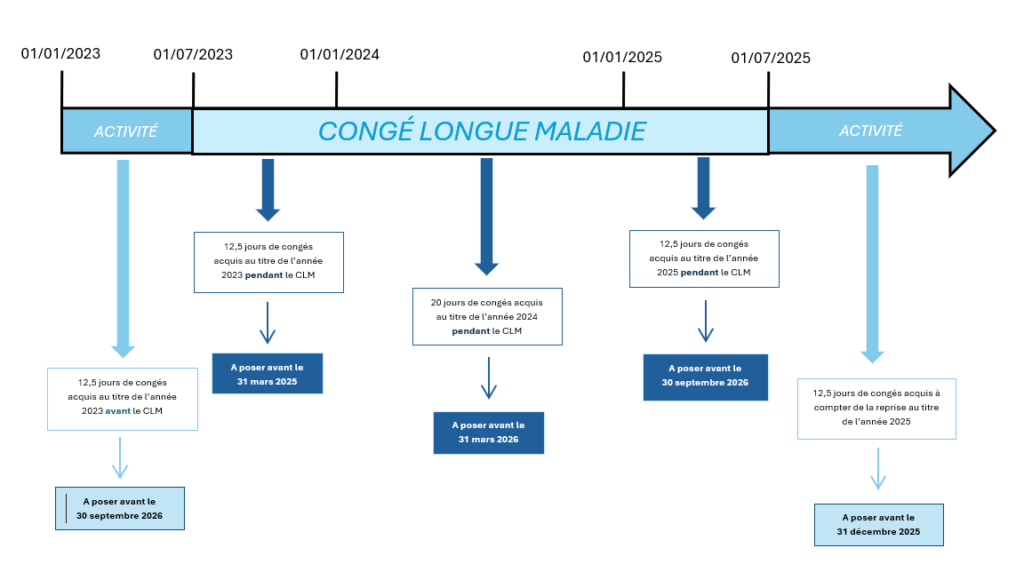 - congés acquis pendant son congé longue maladie (entre le 1er janvier 2025 et le 30 juin 2025) soit 12,5 jours : reportés jusqu’au 30 septembre 2026 inclus (période de report de 15 mois à compter du 1er juillet 2025),